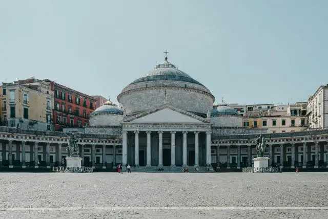 במרכז החזותי של הכיכר ניצבת Basilica of San Francesco di Paola. מדובר באחד המבנים הנאו-קלאסיים המרשימים ביותר באיטליה. הבזיליקה מזכירה בעיצובה את הפנתאון ברומא, עם כיפה עצומה ושורת עמודים מרשימה. היא יוצרת נוכחות דרמטית כבר מרחוק. זהו אחד הסמלים הבולטים של הכיכר.